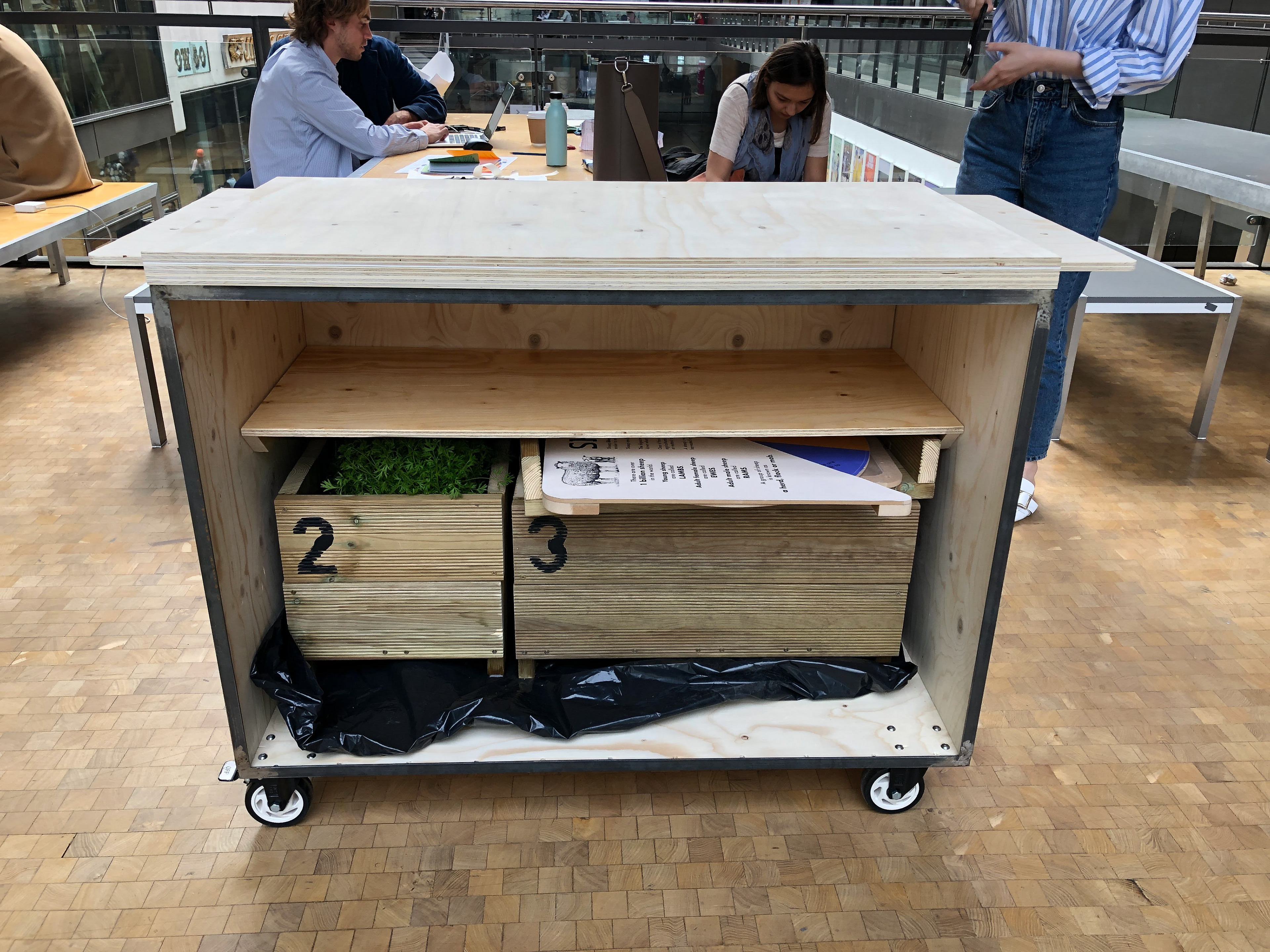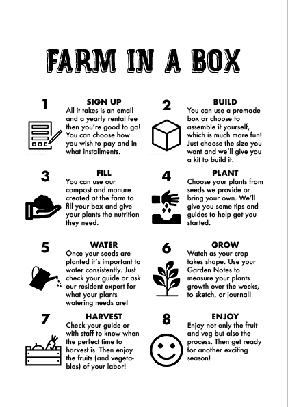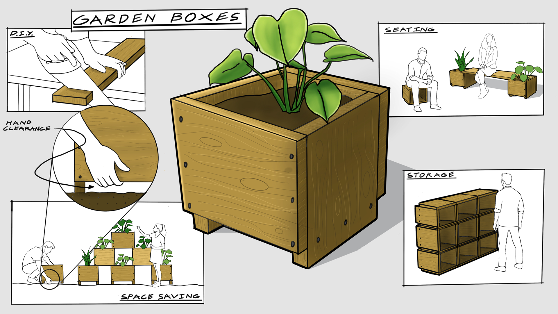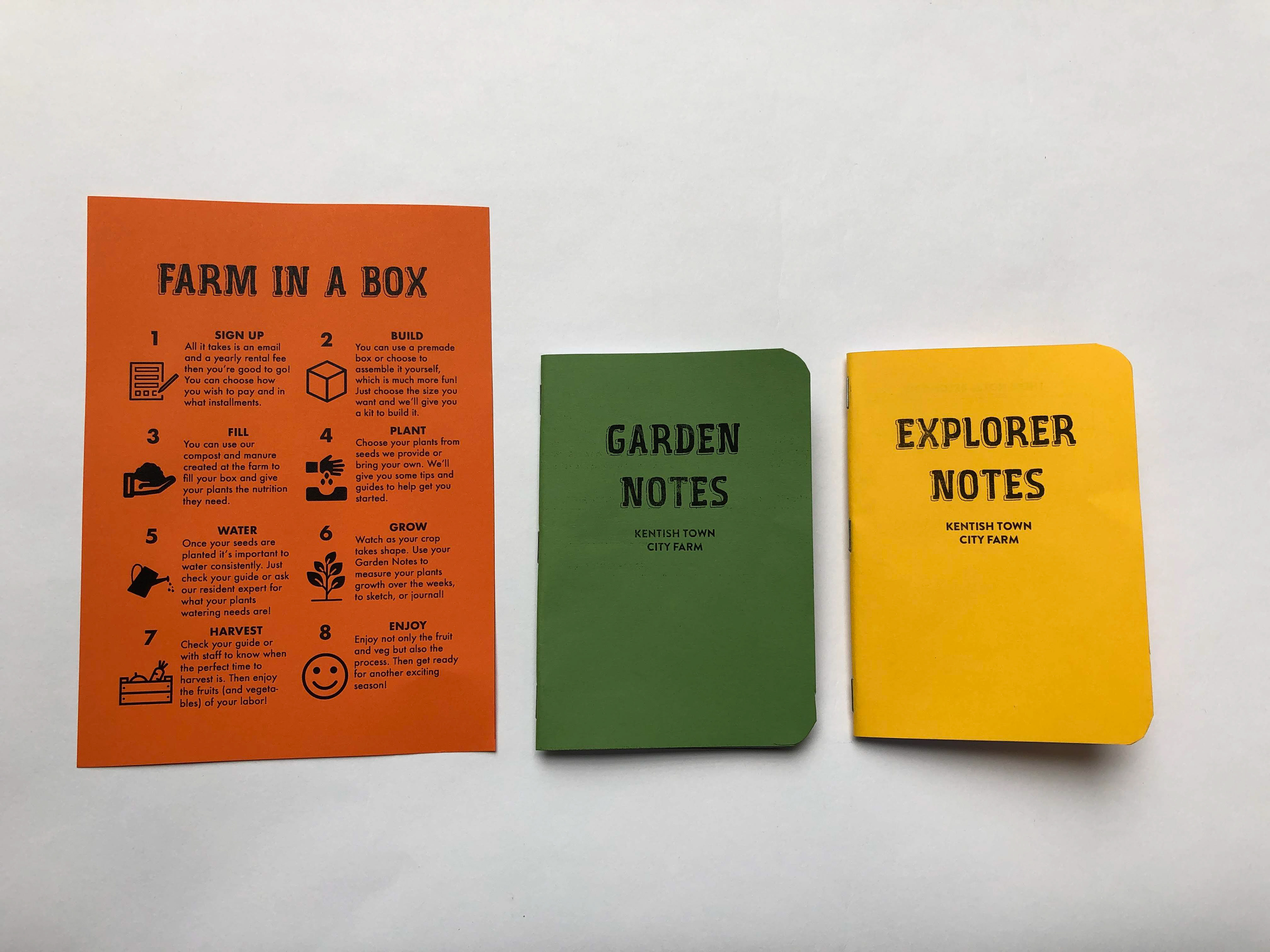 We designed stackable planters to save space and avoid the polluted soil below. They also acted as adaptable furniture throughout the farm. These boxes were designed to be made from minimal material, skill, and tools to keep costs down. We also designed a scheme for the boxes to be rented out to community members as well as notebooks for box owners and child visitors.